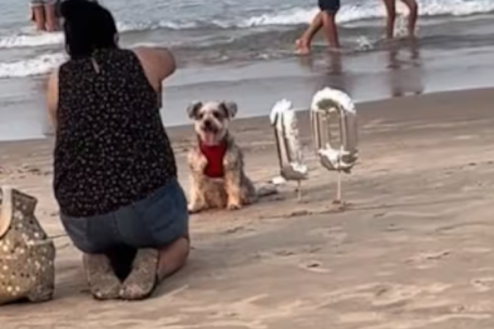 En el video, se puede observar a la mujer dedicando su tiempo y cariño a fotografiar a su perrito, aparentemente de raza schnauzer, a la orilla del mar. Un detalle conmovedor adorna la escena: unos globos con el número “10” flotan a su lado, conmemorando una década de amor incondicional.