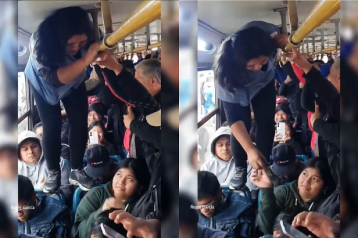 Lejos de desistir, la conductora encontró una solución que está siendo aplaudida por su creatividad: se subió sobre los respaldos de los asientos y avanzó con equilibrio de un extremo a otro para recolectar el pago de cada uno de los usuarios.