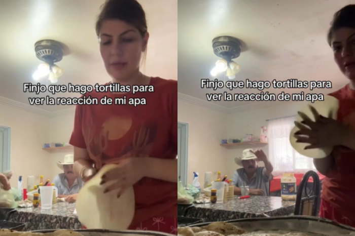 La joven decidió fingir que grababa un video de receta, asegurando a sus seguidores que se había levantado temprano para preparar ella misma tortillas de harina desde cero. Lo que no esperaba era que su padre, que observaba la escena desde la mesa, se robaría el protagonismo del clip.